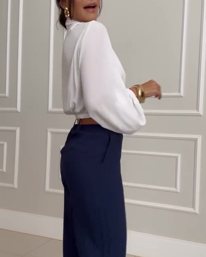 Mode unifarbene V-Ausschnitt Laternenärmel Bluse