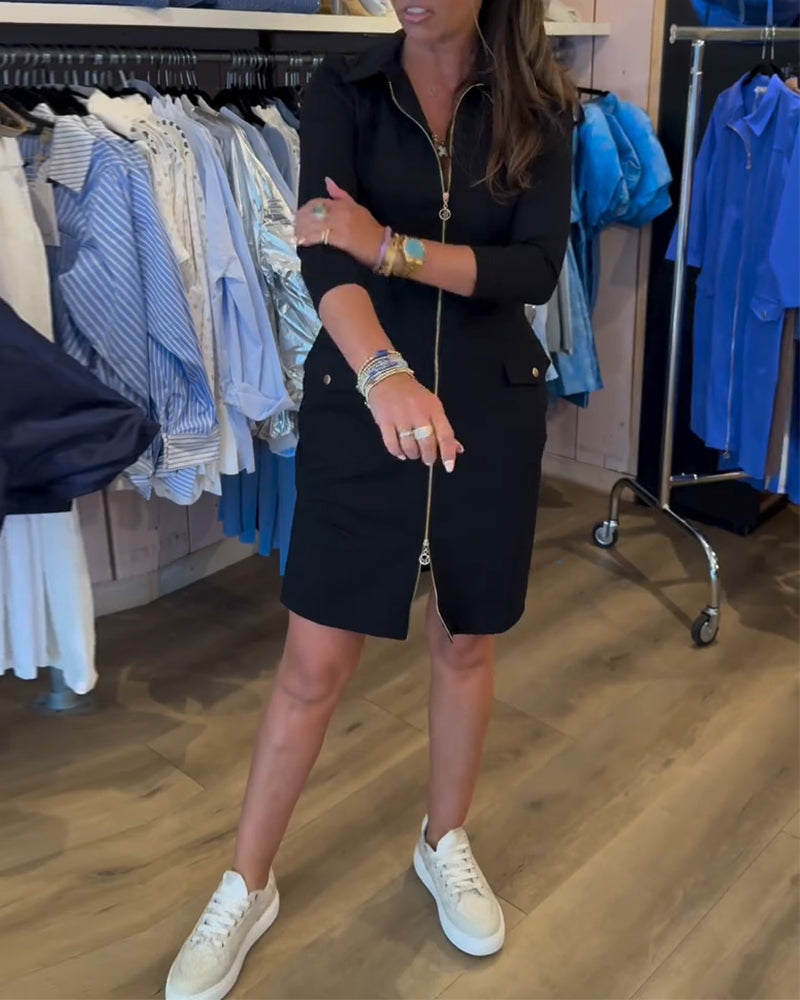 Revers Einfarbiger Reißverschluss Langarmkleid